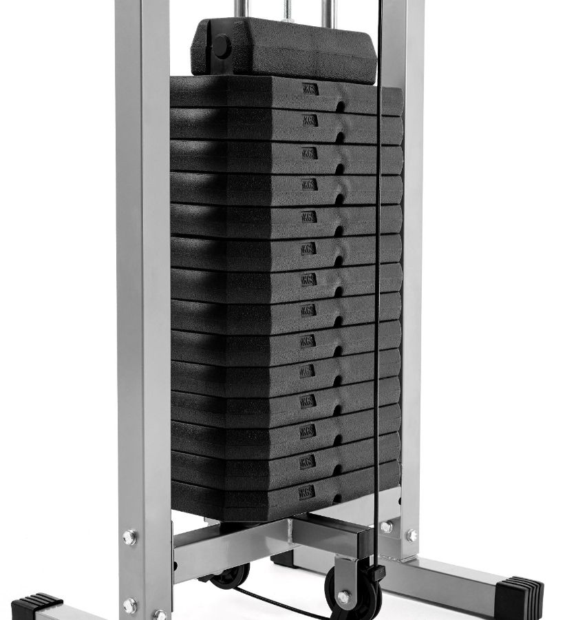 Металлический грузоблок представляет собой металлические пластины со втулками для шумопоглощения. Чаще всего используется в профессиональных тренажерах, весьма и весьма надежен, может устанавливаться на модели тренажеров с большим весом грузоблока.